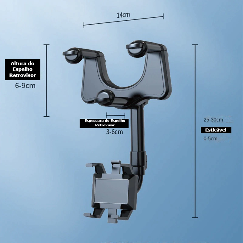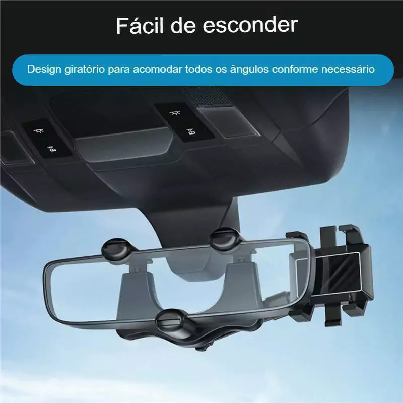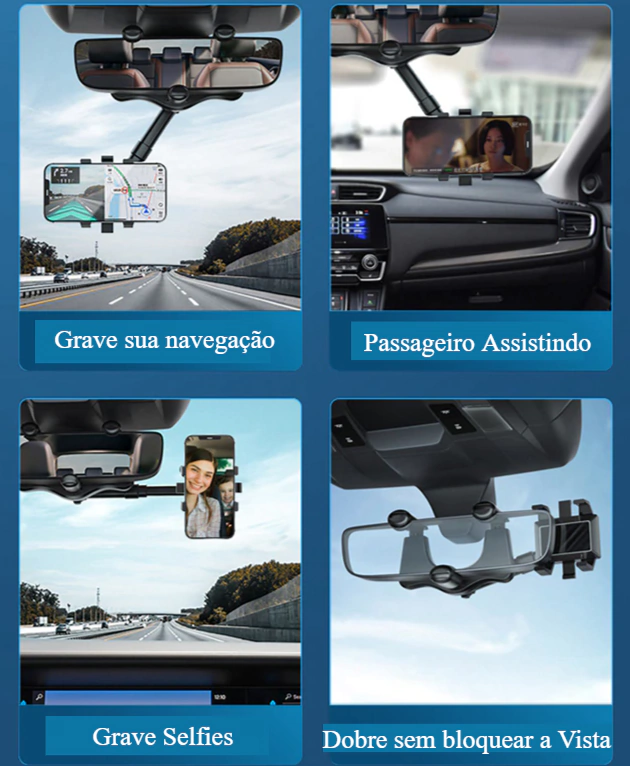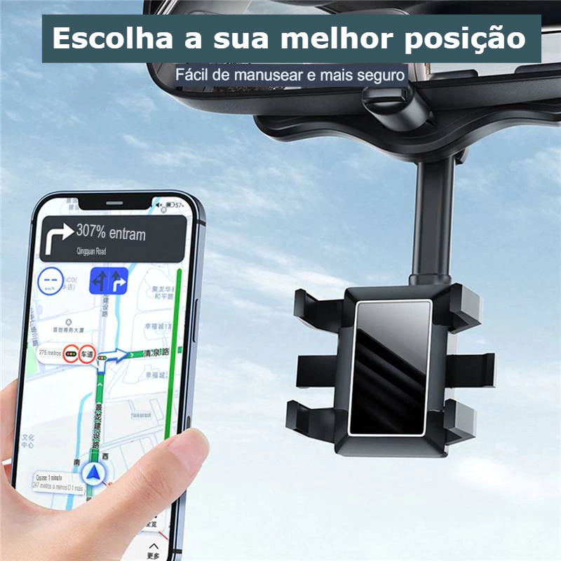 Viagens mais seguras: Mantenha as mãos no volante e os olhos na estrada com o celular posicionado de forma prática e segura no espelho retrovisor.