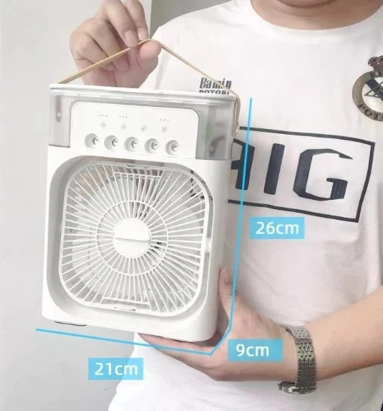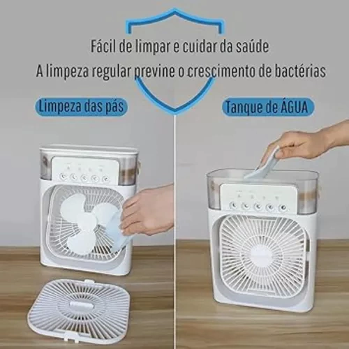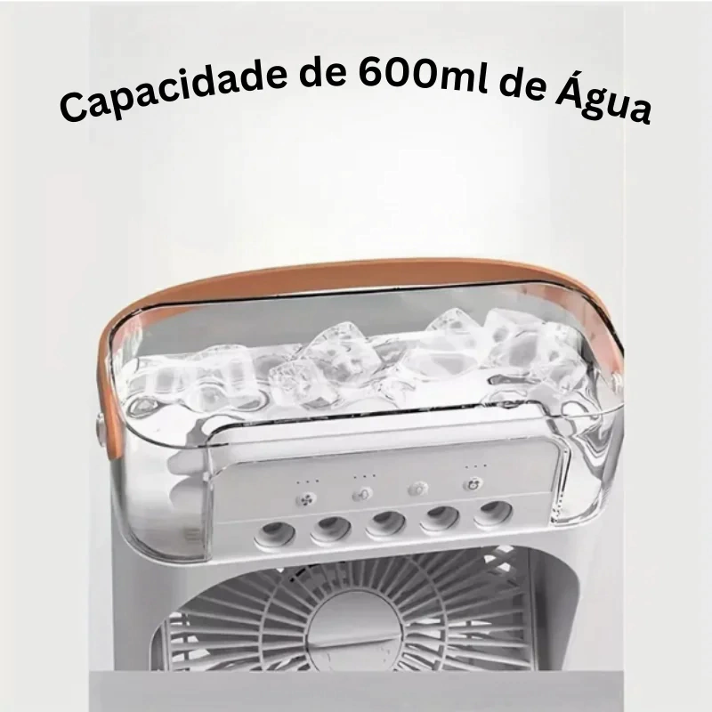 Mini Climatizador Portátil de Ar c/ Reservatório para Água e Gelo e umidificador de ar com 5 sprays ele é portátil com 3 velocidades de ar e luz de LED com 7 cores.